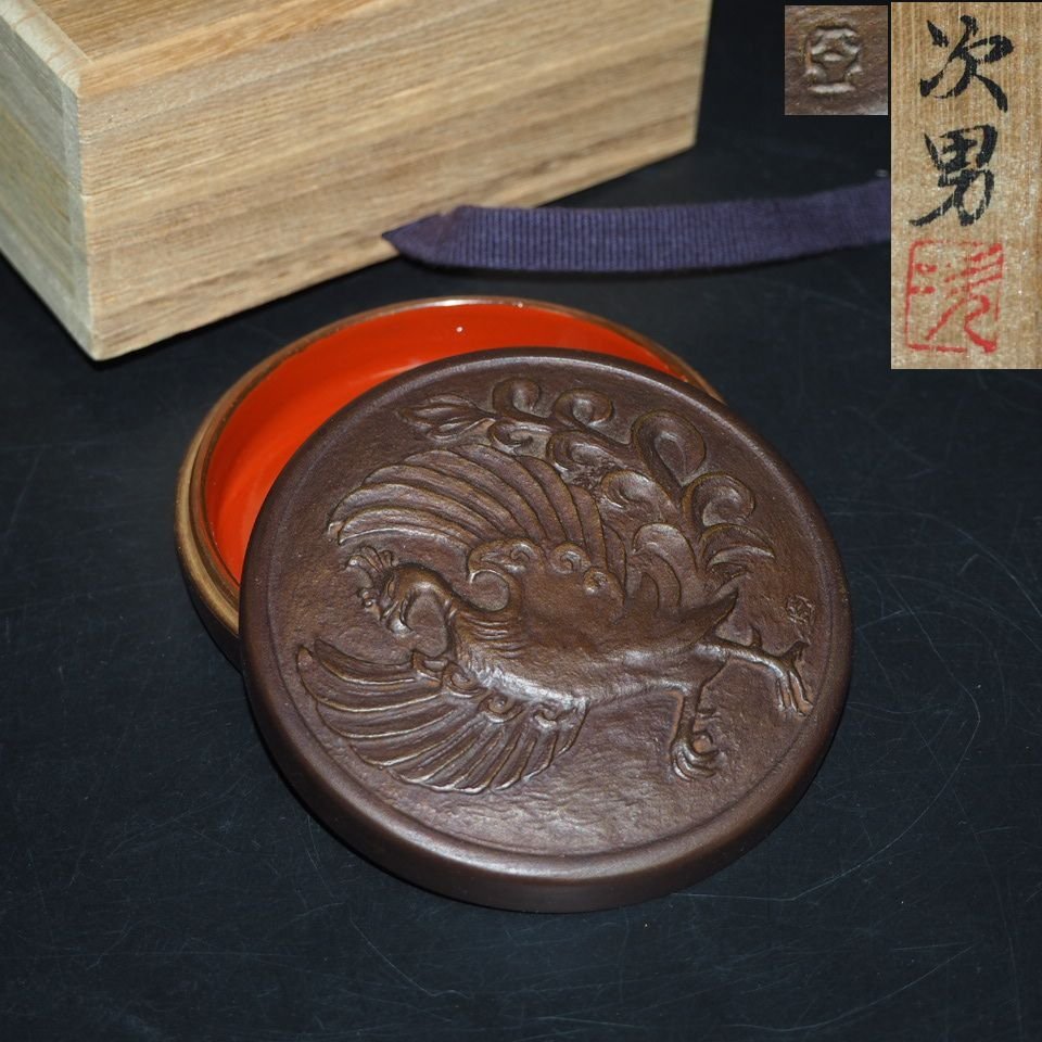 - 【金富士】金工作家『次男』作 銅製鳳凰文朱肉盒/印泥盒 共箱・黄布 検/茶托茶壺古錫玉川堂高岡佐渡銅器龍文堂亀文堂中国古玩骨