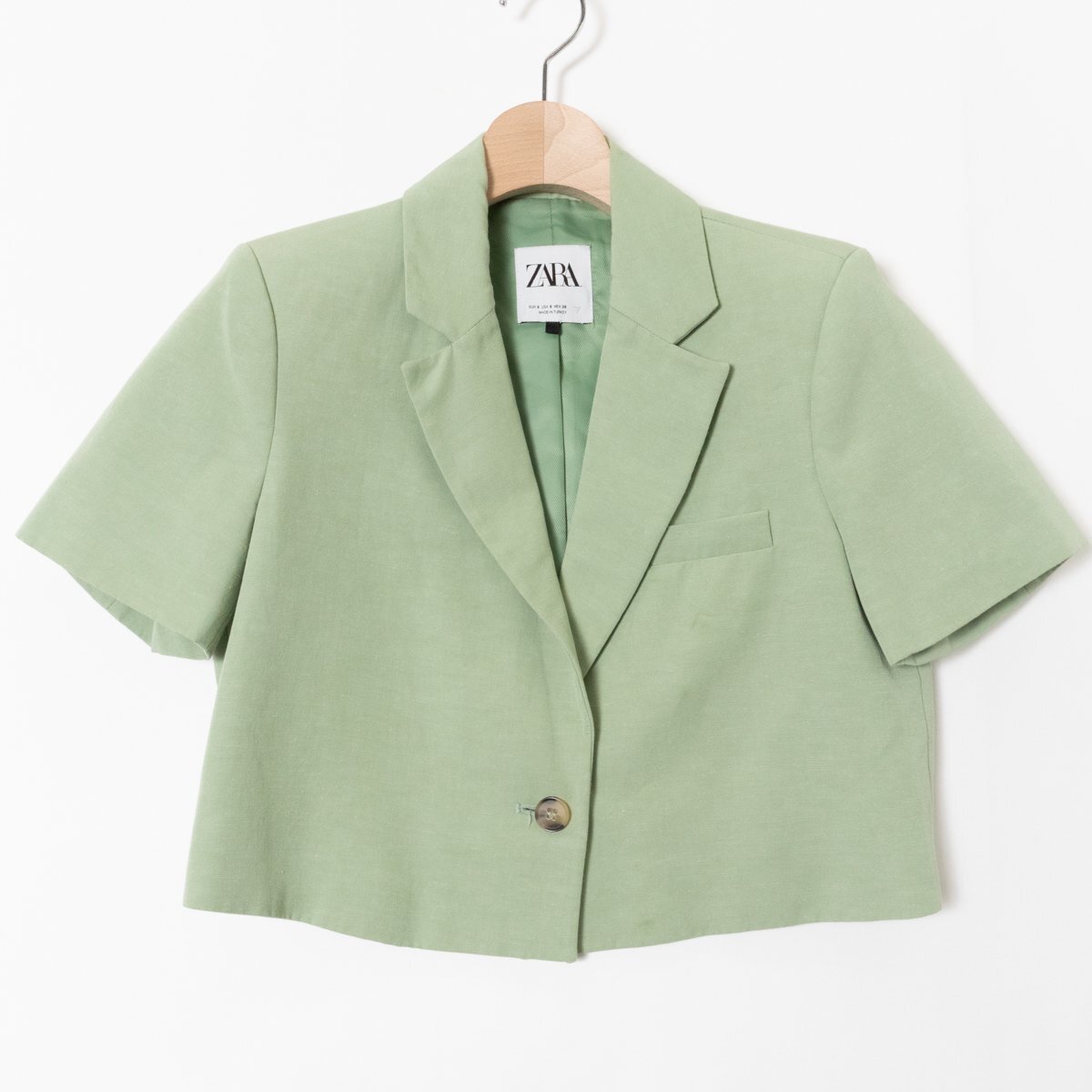 - ZARA ザラ 半袖 ショート丈 クロップド ジャケット ボレロ グリーン Sサイズ レディース 婦人 アウター 羽織 レーヨン コットン 肩パッド