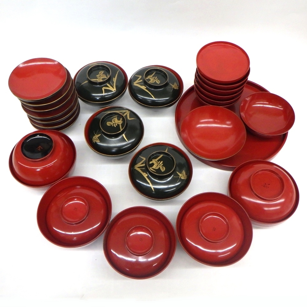 > 25-H-134【まとめセット】黒内朱 蓋付き椀 4客+蓋のみ7枚+朱塗り お盆+色々 吸物椀 お椀 輪島塗? 屋号入り 金彩 沈金 漆器