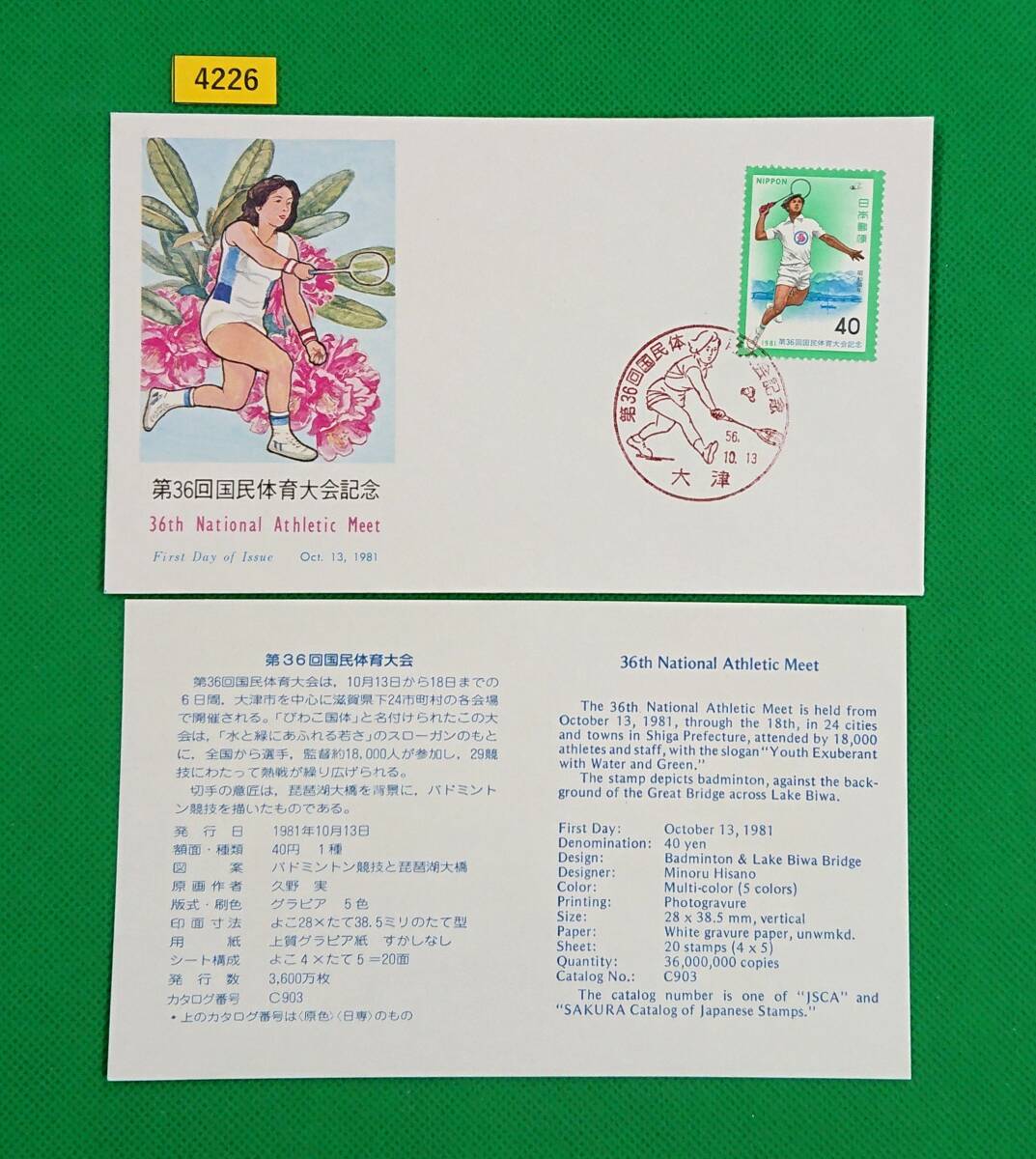 - FDC/第36回国民体育大会/初日印/大津記念印/NCC版/解説書有り/1981年10月13日/初日カバー/№4226