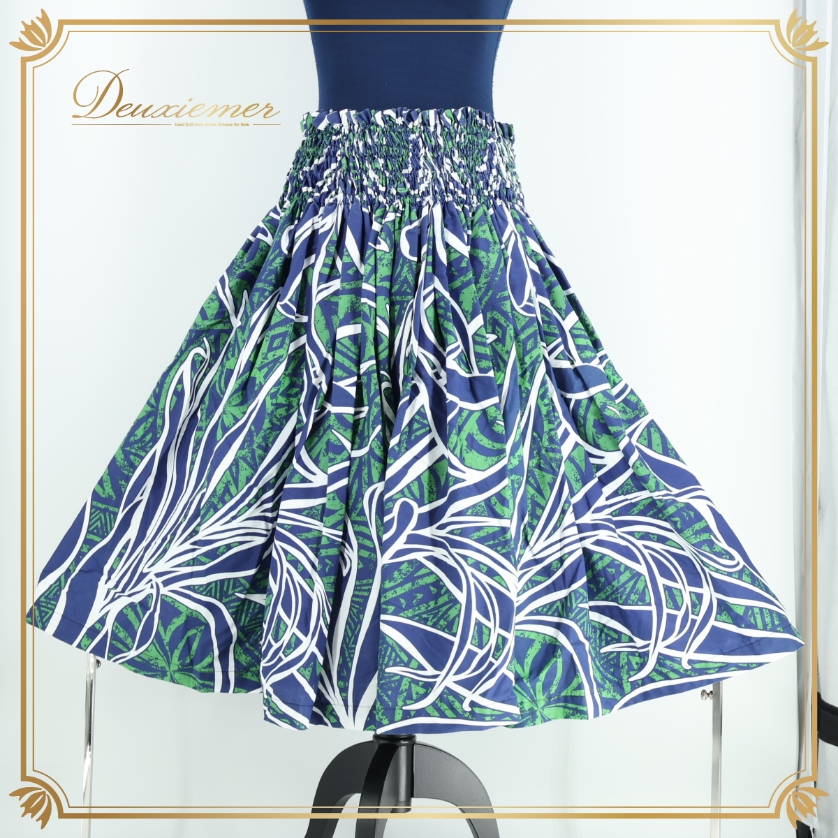 > 『送料無料』【日本製 フラダンス衣装】ネイビー系 Lanai パウスカート 紺 白 緑 ハワイアンプリント アロハ シングル 落ち着いた ホワイト