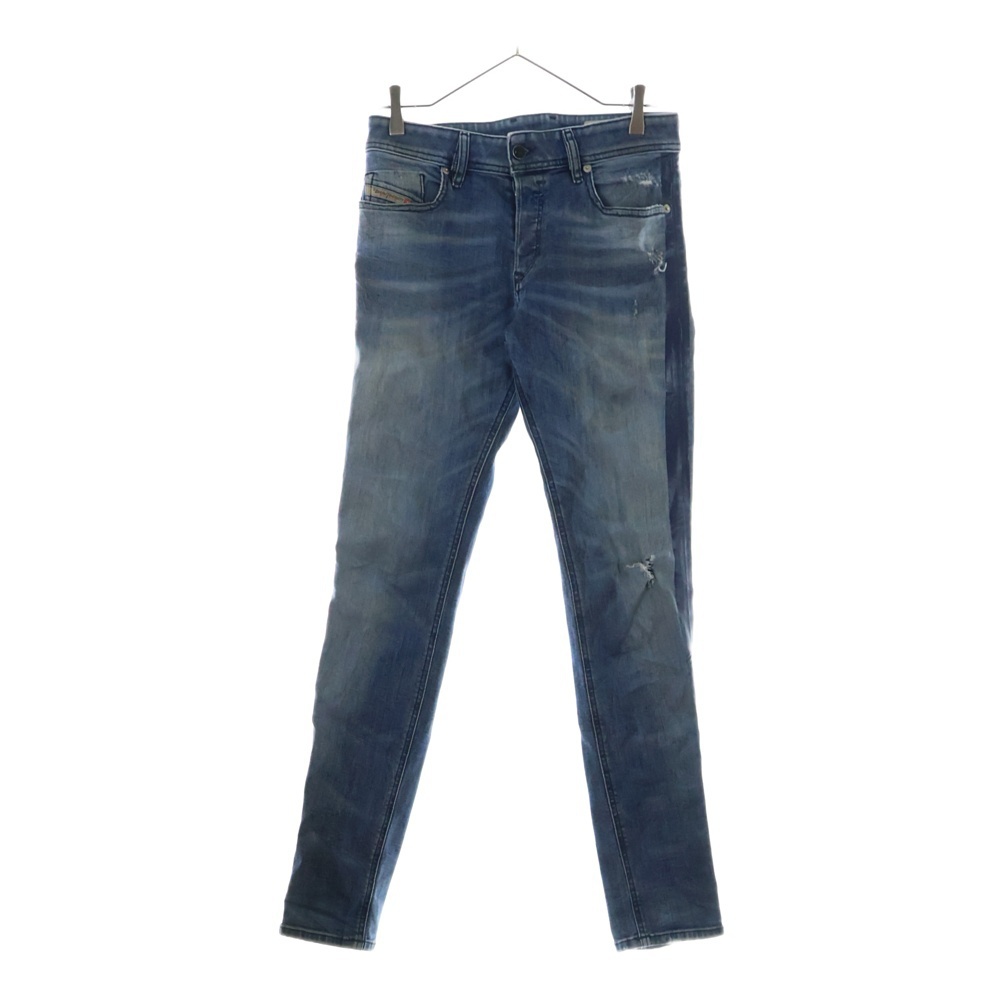 > DIESEL ディーゼル ダメージ加工 ボタンフライ パッチ付 サイドテープスキニーデニムパンツ ブルー RN93243 CA25594