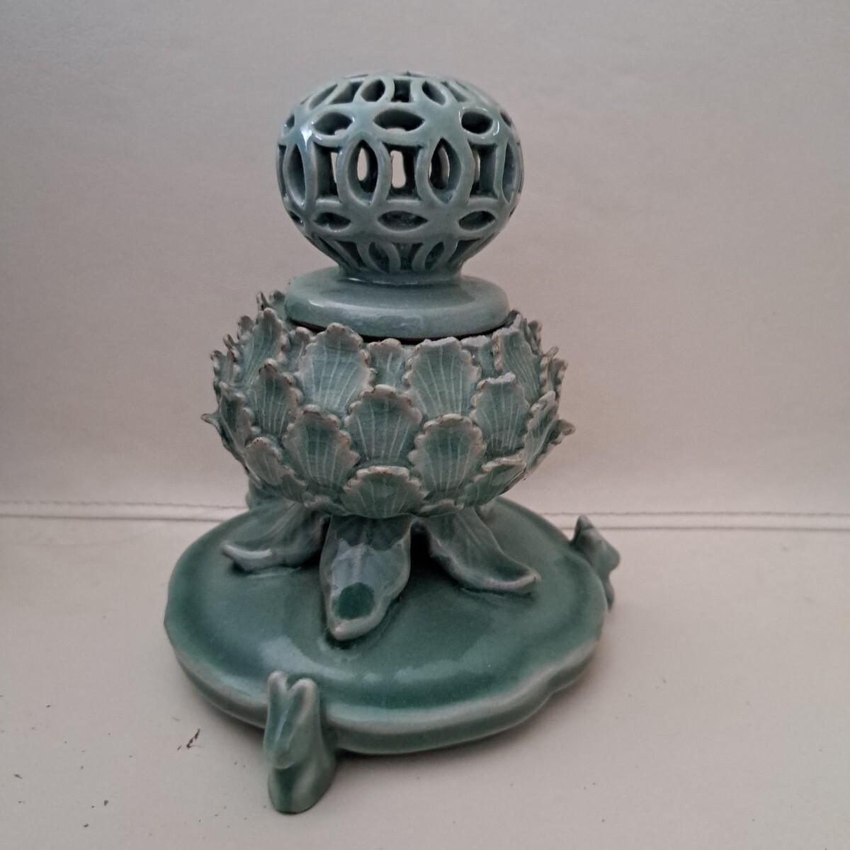 - 海青 青磁香炉 蓮華兎三脚 海青作 香炉 置物