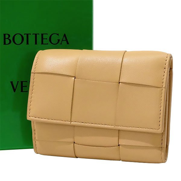 > 送料無料 本物 BOTTEGAVENETA ボッテガヴェネタ カセット 三つ折りファスナーウォレット 651372 レザー アーモンド イントレチャート 財布
