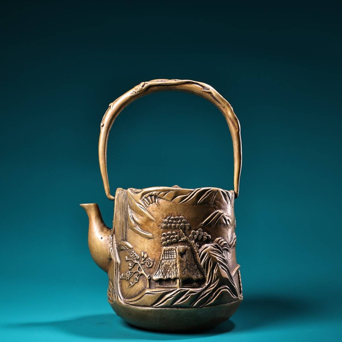 - ▽鴻▽ 銅製 寶石嵌 山水人家紋 提梁壺 置物 賞物 古賞物 古董品 時代物 稀少珍品 中国古玩 中国古美術