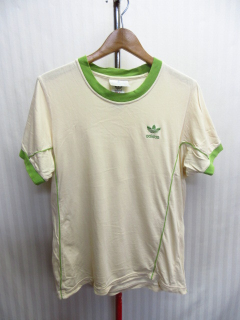 > アディダス 90sヴィンテージ トレフォイル刺繍Tシャツ メンズL クリーム色×緑 三つ葉ロゴ刺繍リンガーTシャツ 半袖カットソー 07241