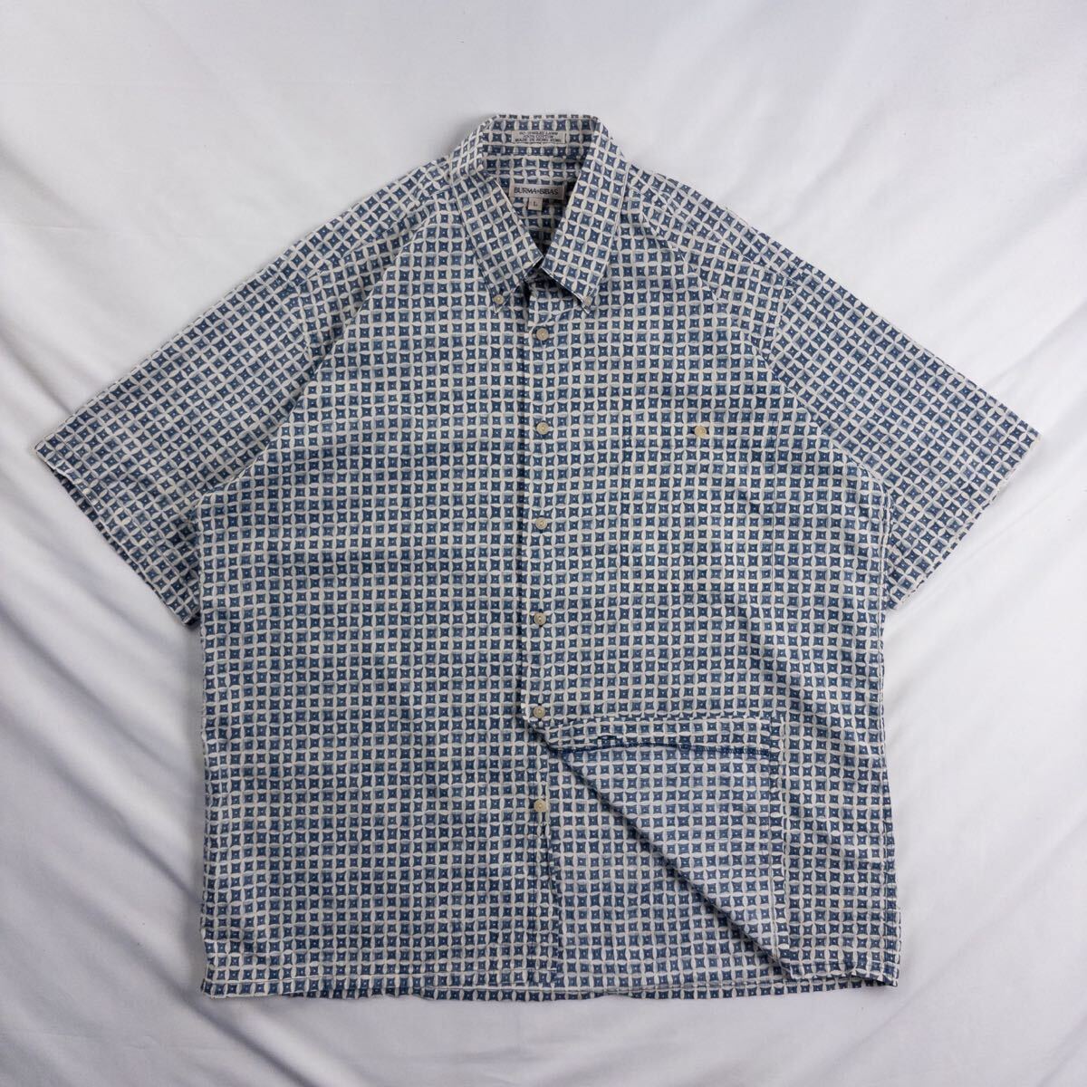 - US Vintage 90-00s BURMA BIBAS コットン ボタンダウン くすみカラー 装飾 オーナメント 幾何学模様 アート ボックスシルエット 総柄シャツ