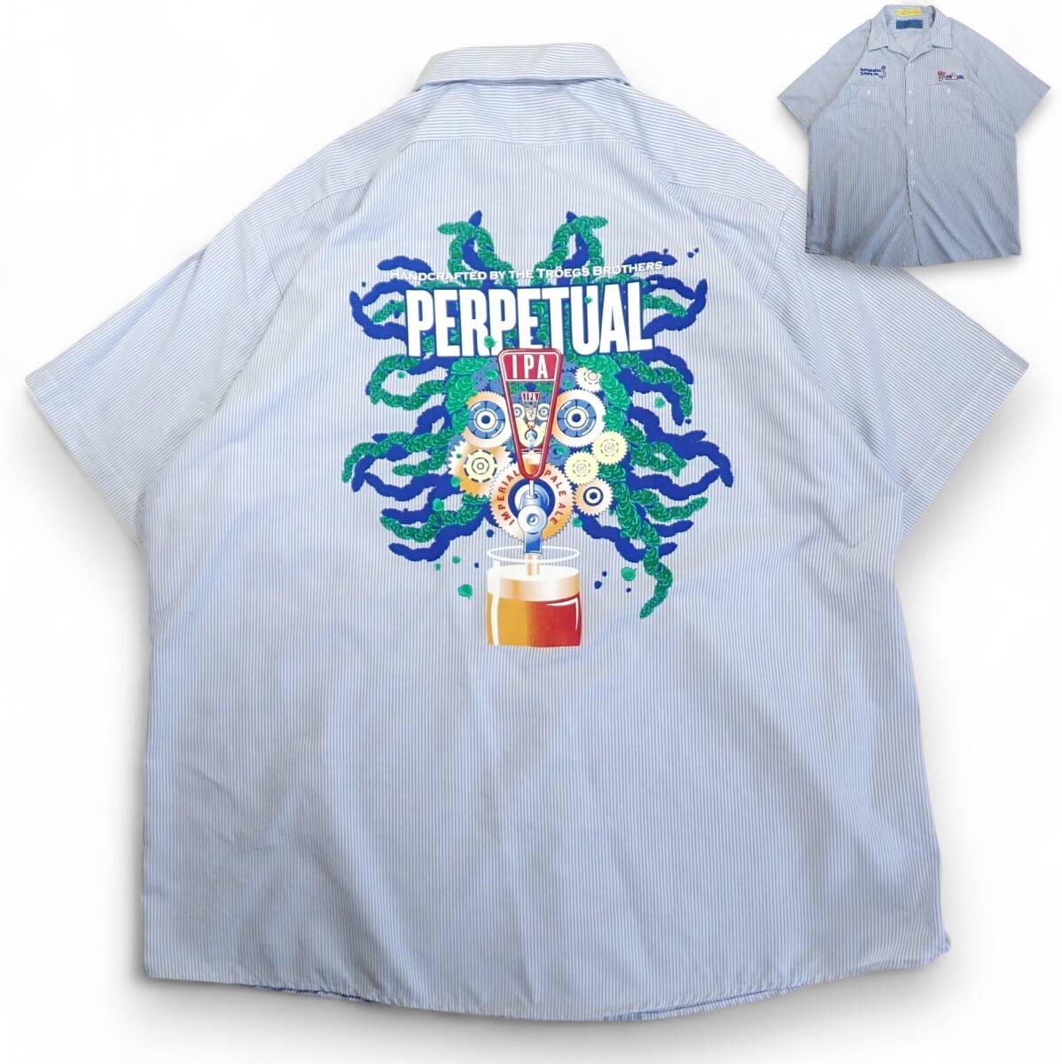 > 6875/CiNTAS 半袖 ストライプ ワークシャツ XL●PERPETUAL IMPERIAL HANDCRAFTED TROEGS INDEPENDENT BREWING BROTHERS●洗濯プレス済古着