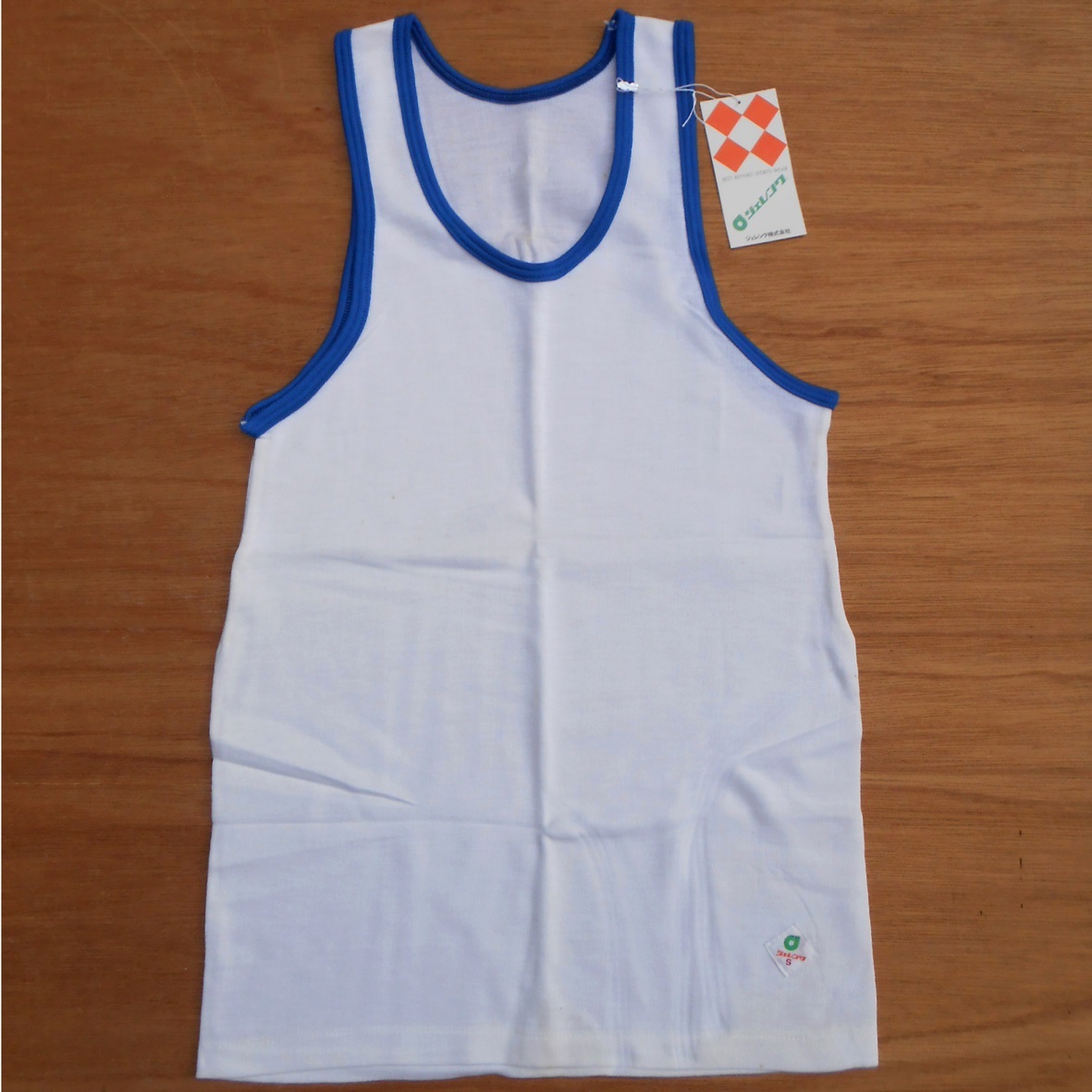- 未使用 '70s Jelenk ジェレンク S タンクトップ 白x青 ブルー 体操服 運動着 学校 体育 ヴィンテージ 昭和 レトロ 当時物 asics アシックス