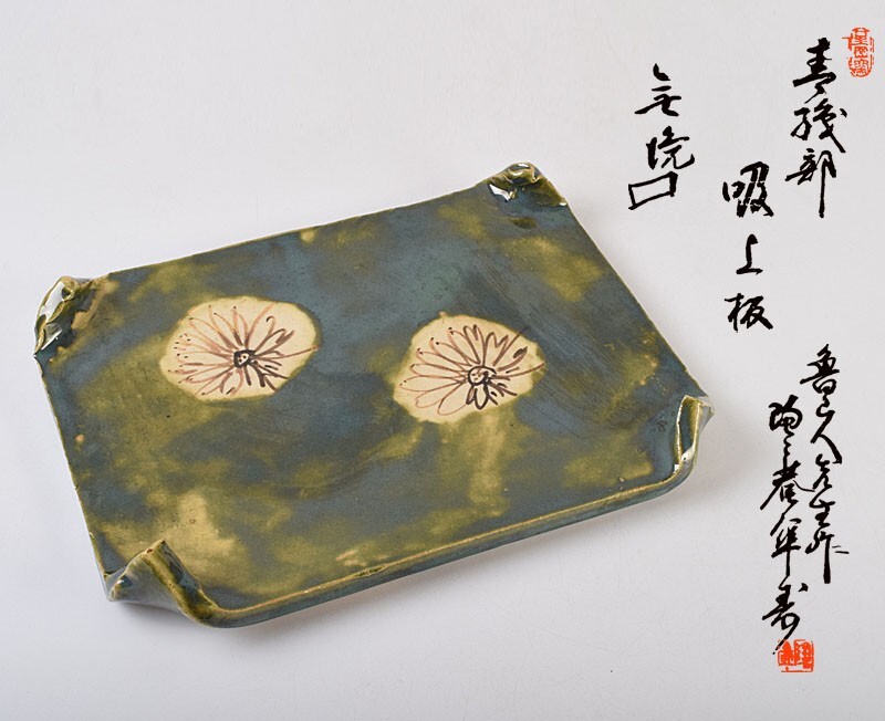 - 北大路魯山人作 青織部 花文 吸上板 長角皿 共布 黒田陶々庵極め箱 MBGS