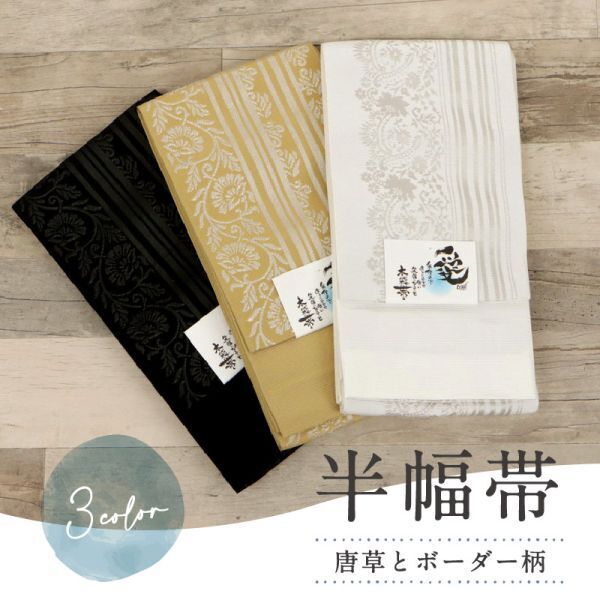 > 【半幅帯】 唐草とボーダー柄 リバーシブル 草花模様 【イエロ―】 小袋帯 ポリエステル 変わり縞 K24-35