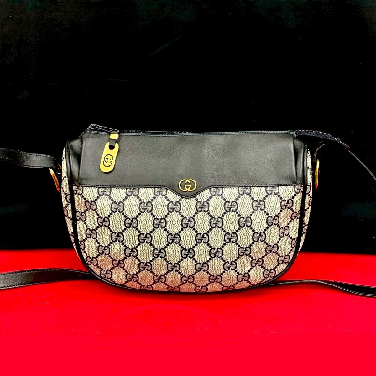 - 極 美品 希少品 GUCCI グッチ オールドグッチ GG ロゴ 総柄 金具 レザー 本革 ショルダーバッグ ポシェット ネイビー 紺 32735