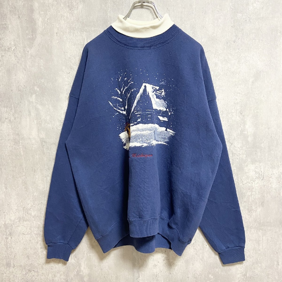 - 古着 used 90s Lee リー 長袖プリントスウェット トレーナー 重ね着風 雪 青 ネイビー USA製 オーバーサイズ