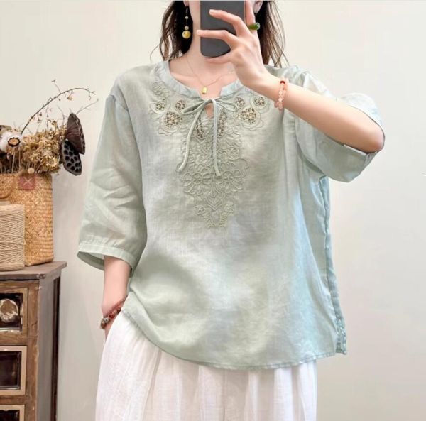 > 新入荷*カジュアル 半袖シャツ 刺繍シャツ 薄手 トップス 大きいサイズ ブラウス オフィス OL ビジネス 通勤 着痩せ チュニック*緑