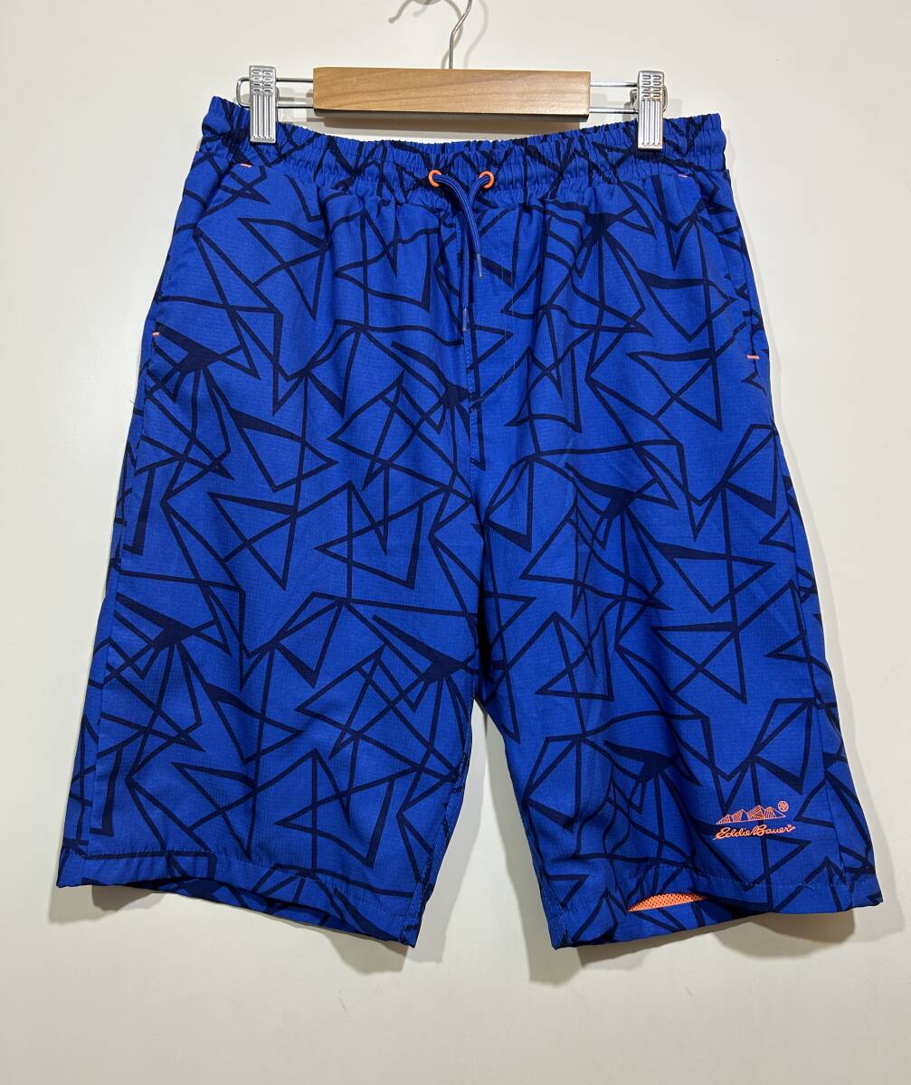 > ● Eddie Bauer キッズ 水陸両用 ポリパンツ イージー ハーフパンツ 青 ブルー 幾何学模様 総柄 裏メッシュ 伸縮 XL 18/20 レディース