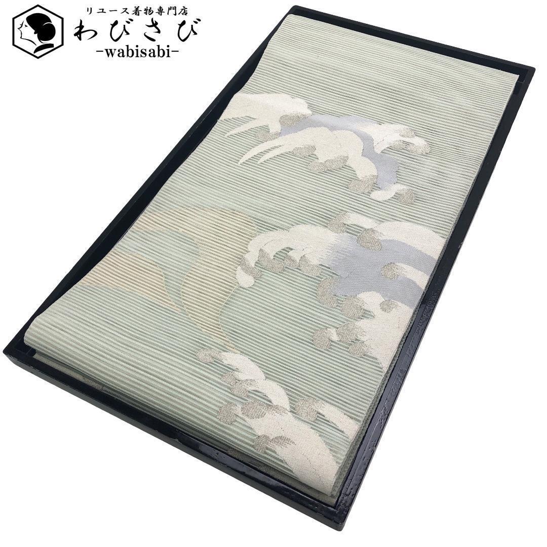 > 夏帯 袋帯 絽 波模様 白緑色 銀糸 O-5341 着物 きもの kimono 和服 和装 中古 リサイクル着物 【送料無料】