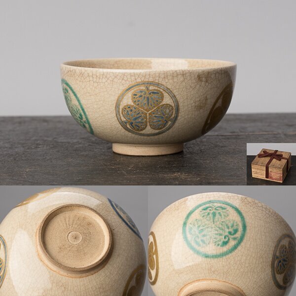 > 【千h0322】古清水 三つ葉葵紋 小碗 桐箱 ぐい呑 碗 葵紋 三葉葵紋 京焼 清水焼