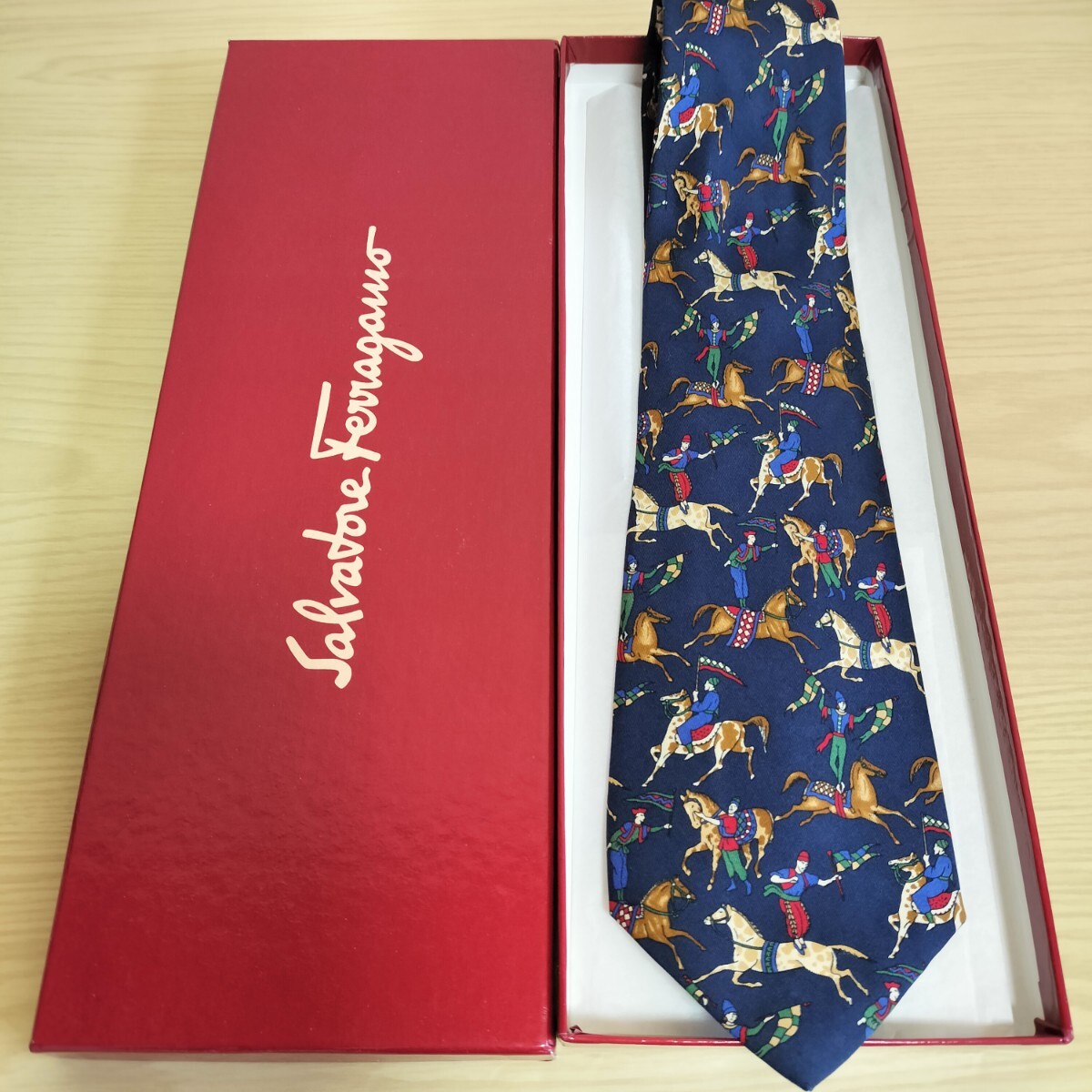 - Salvatore Ferragamo(サルヴァトーレフェラガモ)青馬上人旗振り模様ネクタイ
