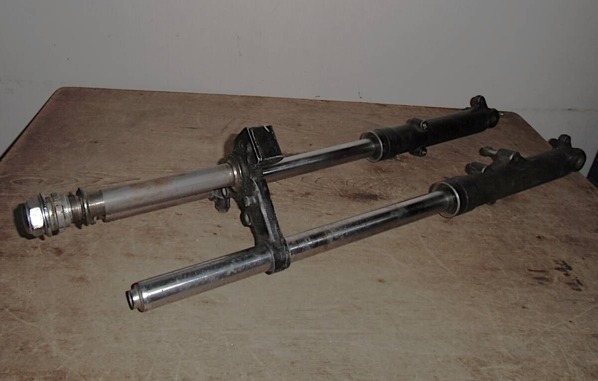 > ★ こ-816 バイク 旧車 フロントフォーク 左右 中古 当時物 ※ 片側キャップボルト1個なし 現状品 約 高さ67cm 幅18cm 奥14cm 重さ5.6kg