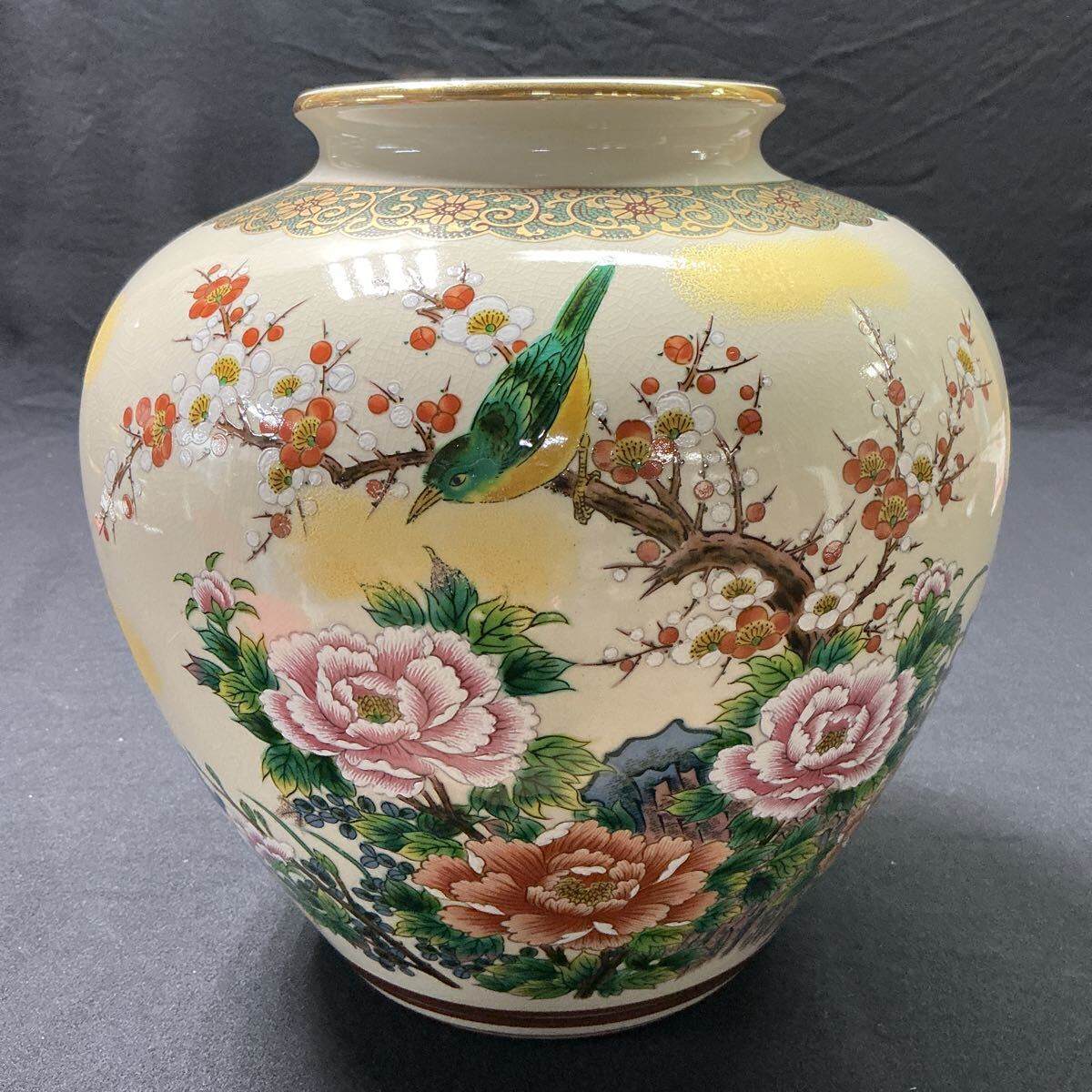 - 【L8B442】九谷陶孫 花器 金彩 梅 牡丹 鳥 高25cm 口径12.7cm 壺 床の間飾 花瓶 レトロ