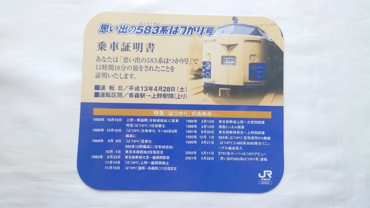 - ■JR東日本■思い出の583系はつかり号 乗車証明書■平成13年
