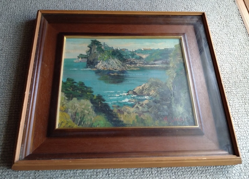 - 【貴重】油彩 肉筆 風景画『雑賀崎』F6号 サイン有り ガラス額入り 作者、詳細不明 真作か模写か不明