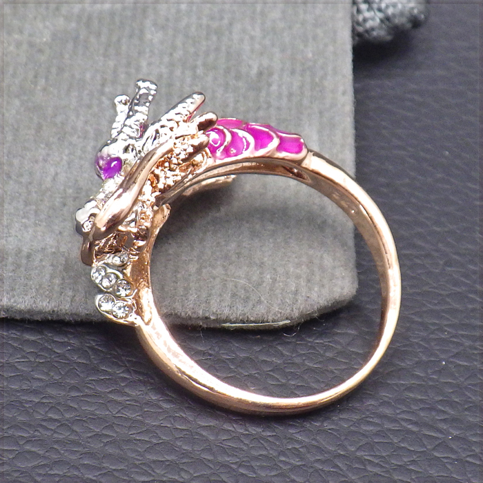 - [RING] 14K 585 Rose & White Gold Plated ローズ & ホワイト ゴールド パープル エナメル CZ ドラゴン 青龍 リング 16号 【送料無料】