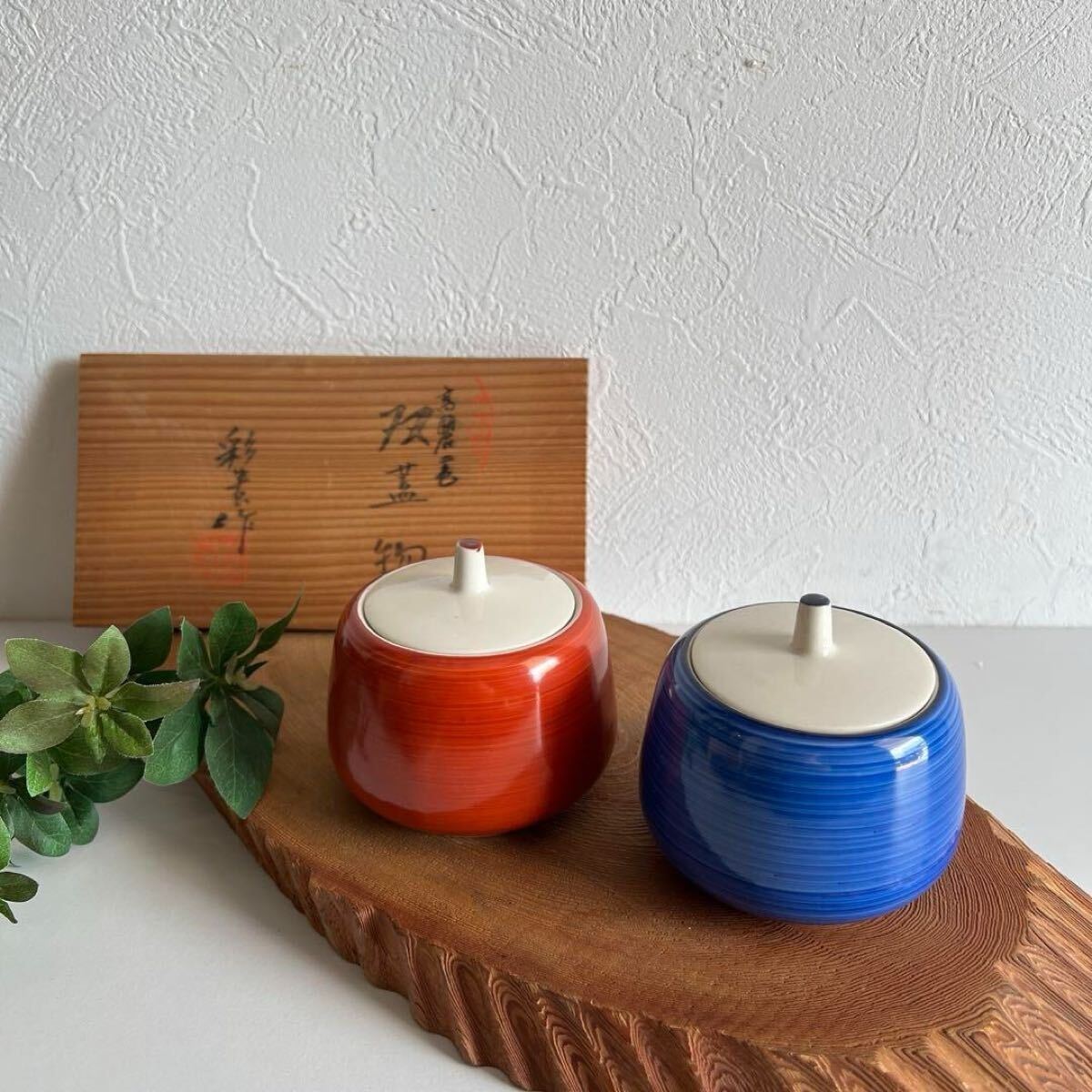 > wasabi k767 有田焼 彩堂造 高麗二色 双蓋物 陶器製 和食器 蓋付き小鉢 蓋つき煮物椀 共箱入り 朱色・紺色 和食器セット