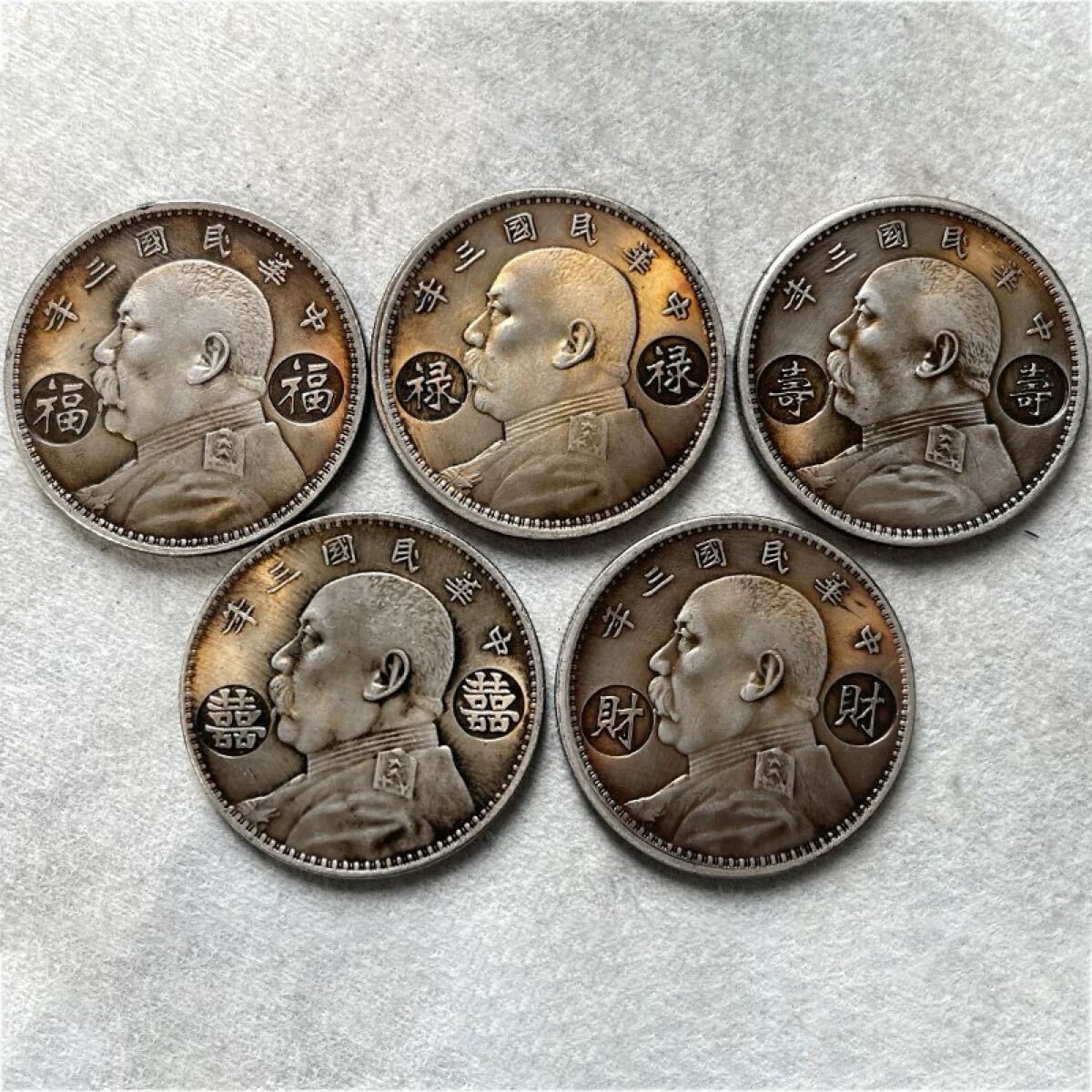 - 珍藏品 中華民國 袁大頭 福祿壽喜財 祝壽銀幣 5枚組 直径39mm 古銭 骨董 骨董品 大型硬貨 外国銀貨 貿易銀 銀貨 コレクション 収蔵品 貨幣