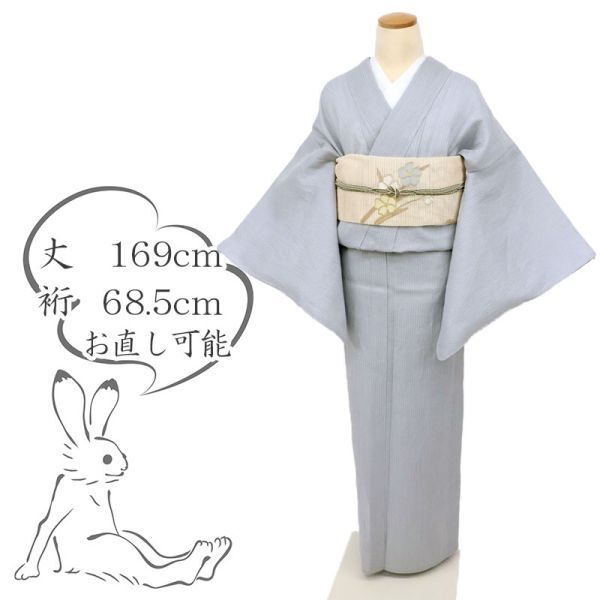 > 【小紋】 新品 長尺 本麻 『近江ちぢみ』 縞 ブルーグレー 夏着物 KH5-11