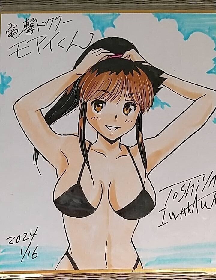 - 【直筆カラーサイン入りミニ色紙】岩村俊哉先生 電撃ドクターモアイくん 天堂 夜叉子 黒ビキニ 水着
