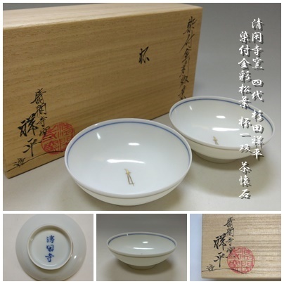 - 【T-465】清閑寺窯 四代 杉田祥平 染付金彩松葉 杯 一双 共箱付 茶懐石