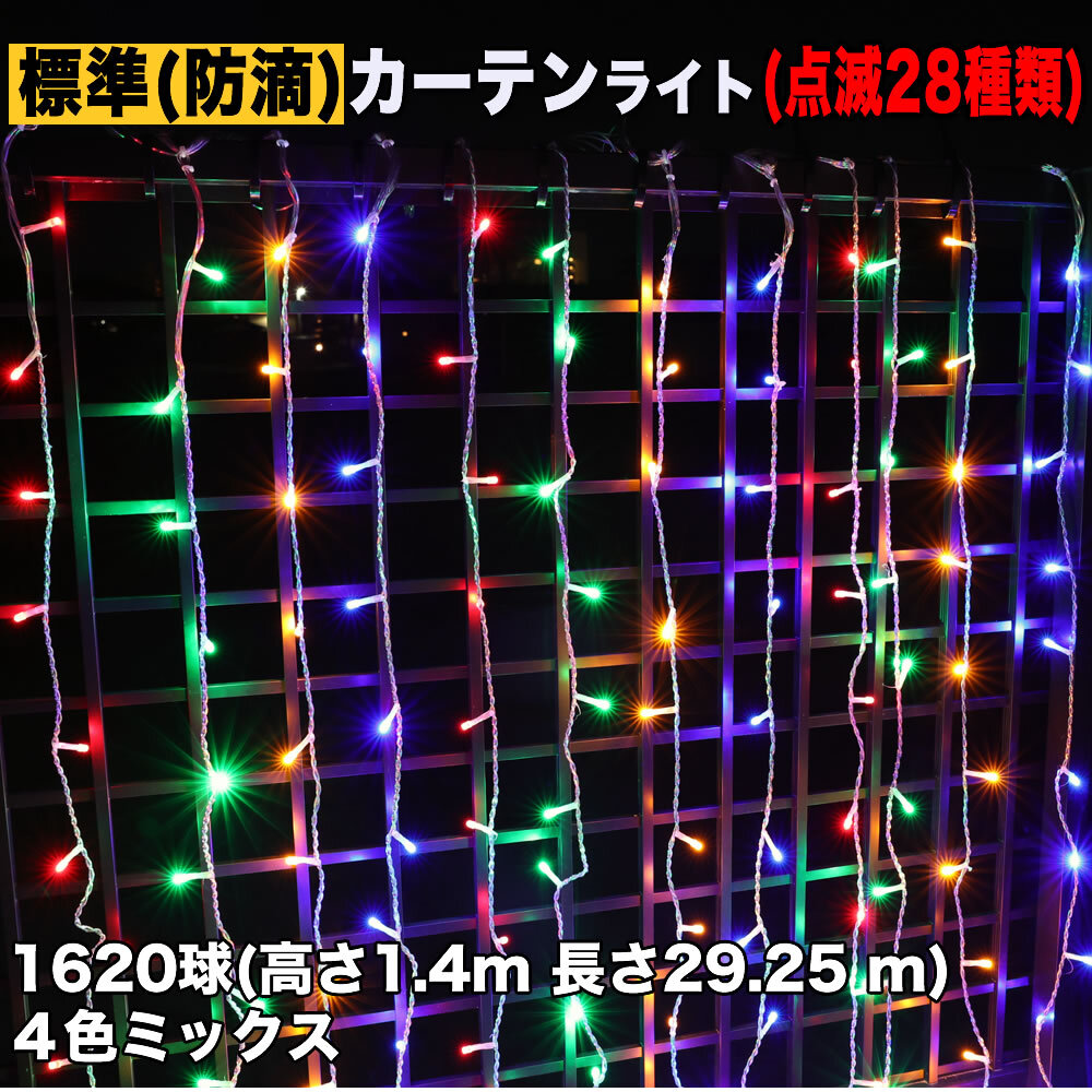 > クリスマス イルミネーション 防滴 カーテン ライト 電飾 LED 高さ1.4m 長さ29.25m 1620球 4色 ミックス 28種類点滅 Bコントローラセット
