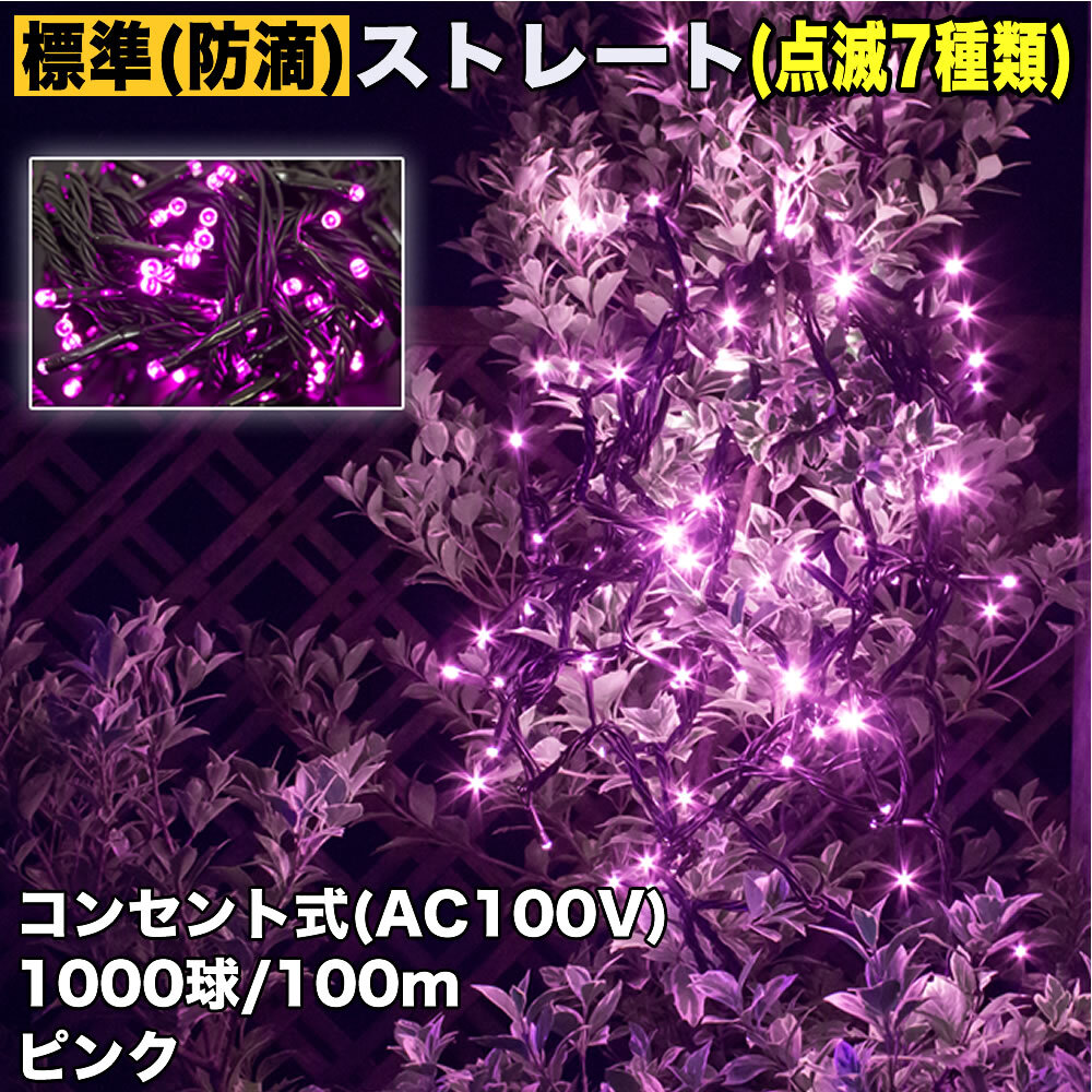 > クリスマス 防滴 イルミネーション ストレート ライト 電飾 LED 1000球 100m ピンク 桃 7種類点滅 Aコントローラセット