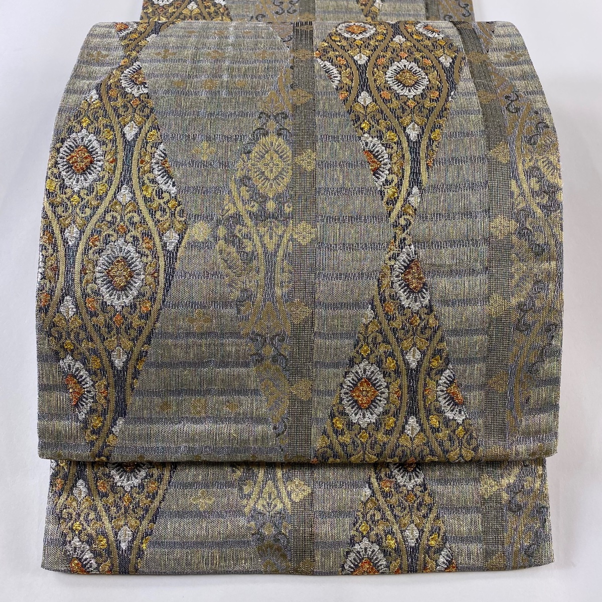 - 袋帯 秀品 立涌 段縞 金銀糸 箔 灰色 六通 正絹 【中古】