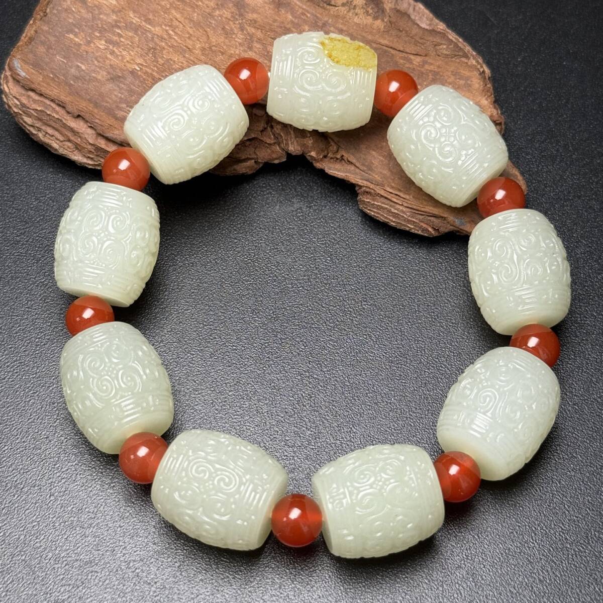 - 旧蔵 清 玉彫 和田玉 如意紋 手串 玉質温潤 極細工 中国古玩 骨董品 古美味 208