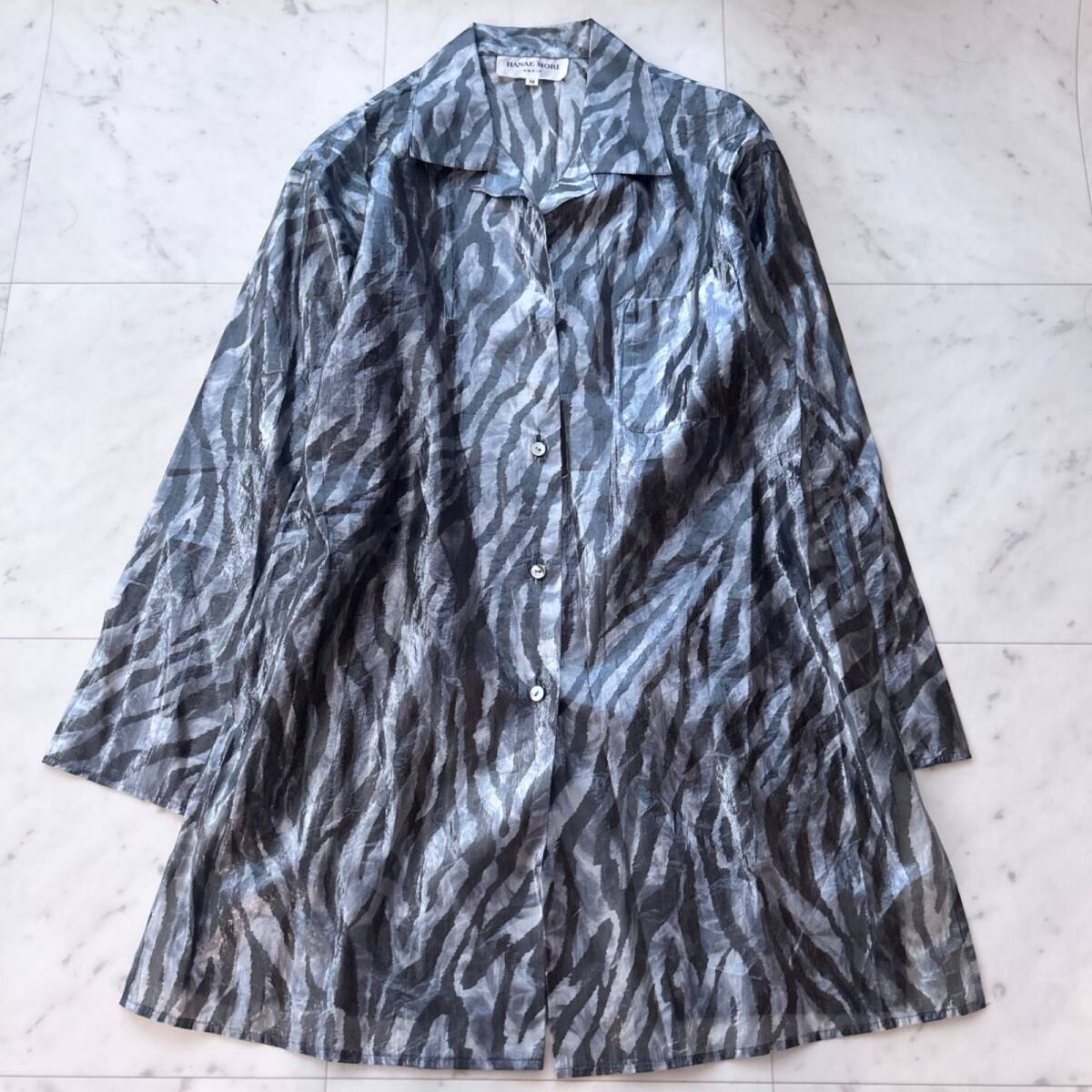 - ハナエモリ 光沢ゼブラ柄 シアーロングシャツ 羽織 シルク混 Mサイズ ゆったり 日本製