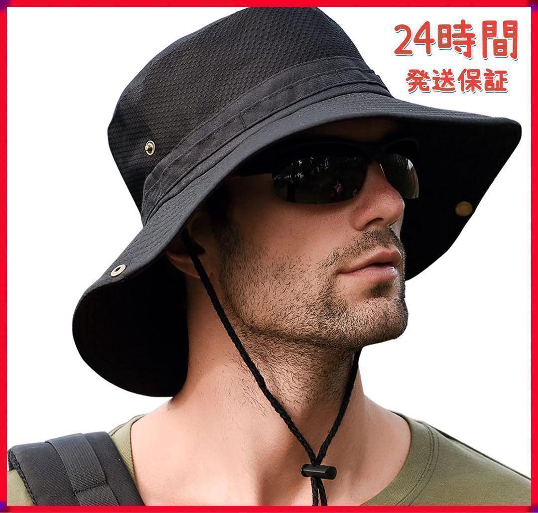 - サファリハット UVカット つば広 速乾 軽量 釣り 登山 ハイキング ブラック