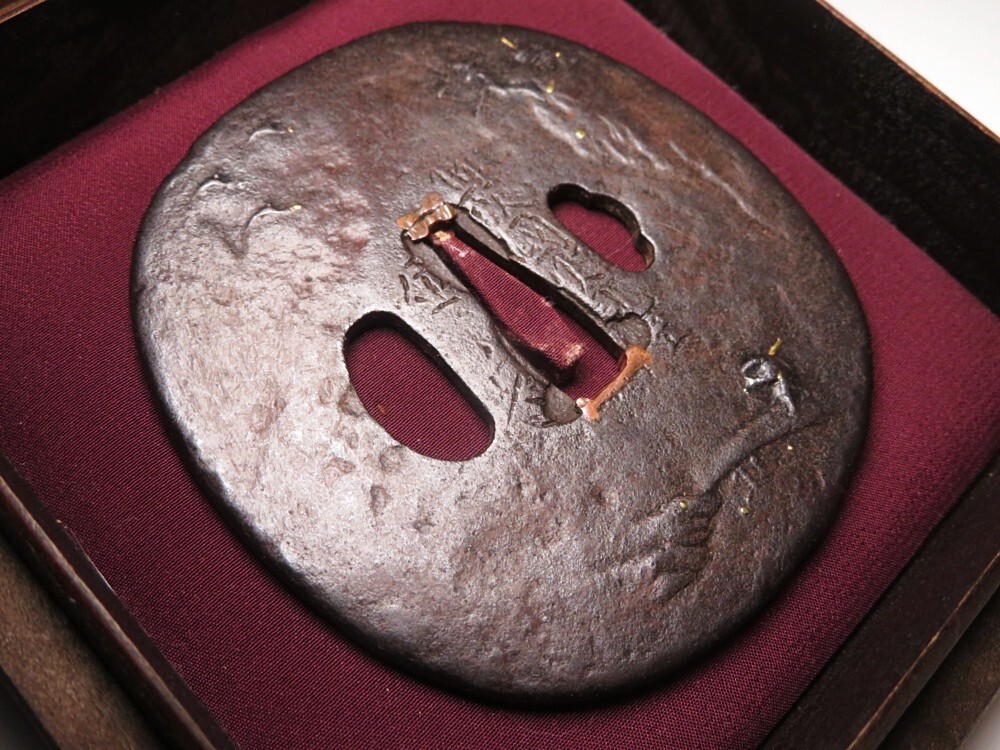 - 【11271】刀装具 江戸~明治 鉄地 在銘 人物 象嵌 鍔(初品・買取品)