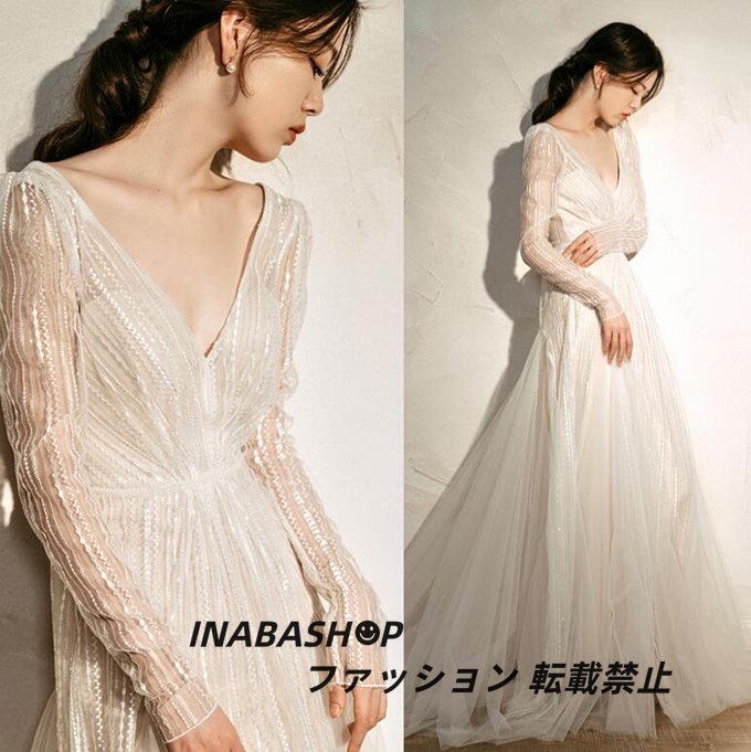 - 長袖 ウエディングドレス ウェディングドレス Vネック 背中空き スレンダーライン トレーンドレス 前撮り 後撮り 結婚式 海外挙式ドレス