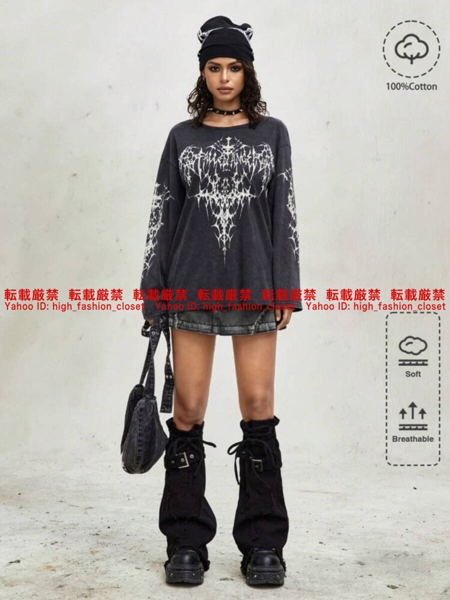 > 【送料無料】新品未使用 SHEIN デスメタル ロゴ ロングスリーブ Tシャツ 長袖 オーバーサイズ 男女兼用 韓国ファッション K-POP Y2K XU DOG