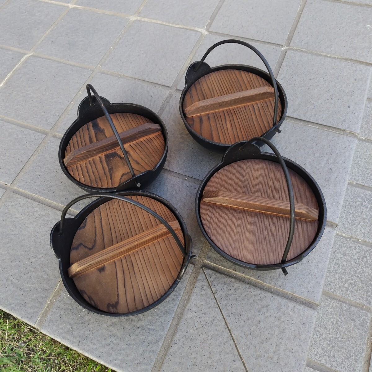 - 鉄鍋 4個で!! 家庭用 木の蓋付き (中古)未使用