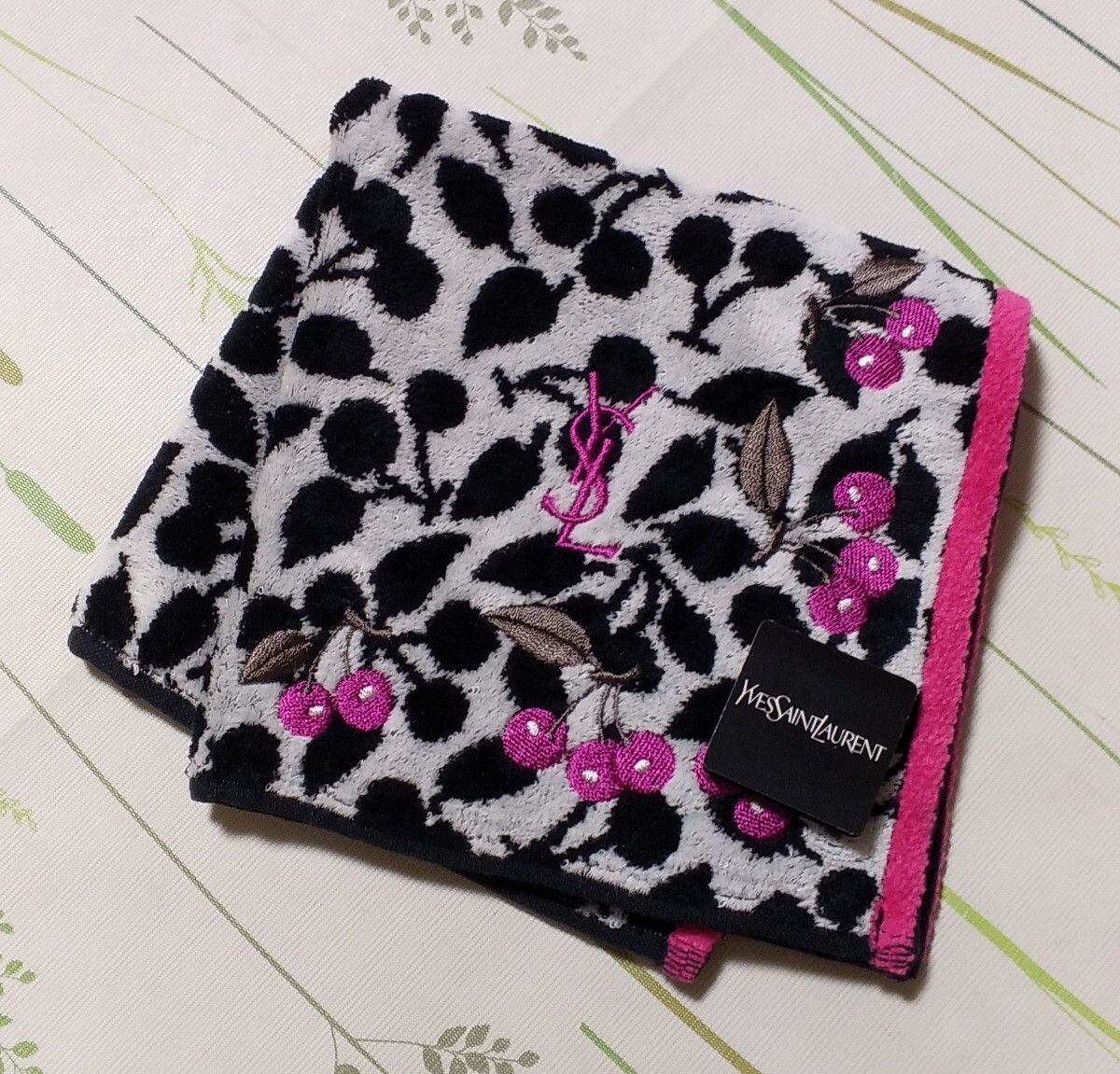 > 送料無料! イヴ サンローラン さくらんぼ 柄 チェリー タオルハンカチ ブラック系 未使用品 日本製