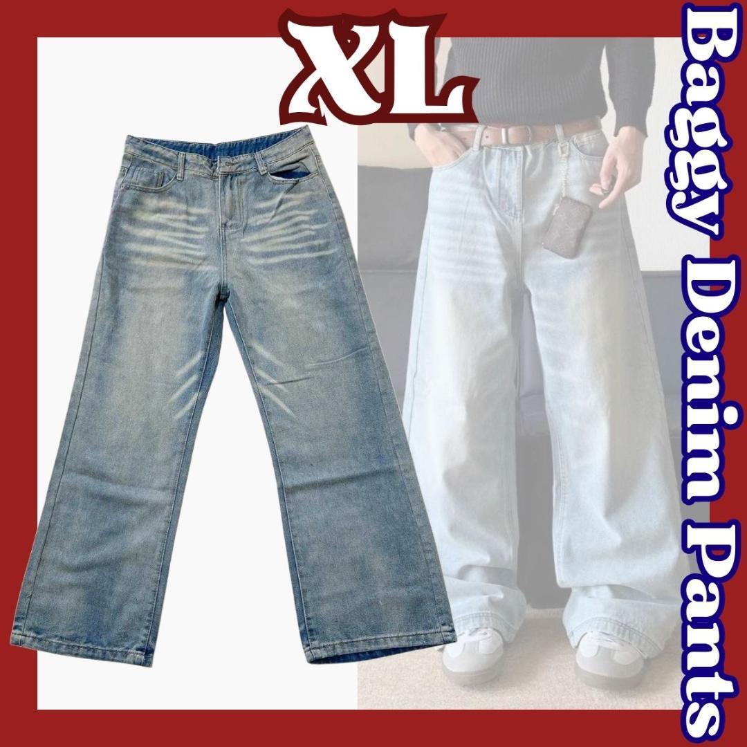 - バギーデニムパンツ XL バギーパンツ ワイド ハイウエスト ユーズドテクスチャ