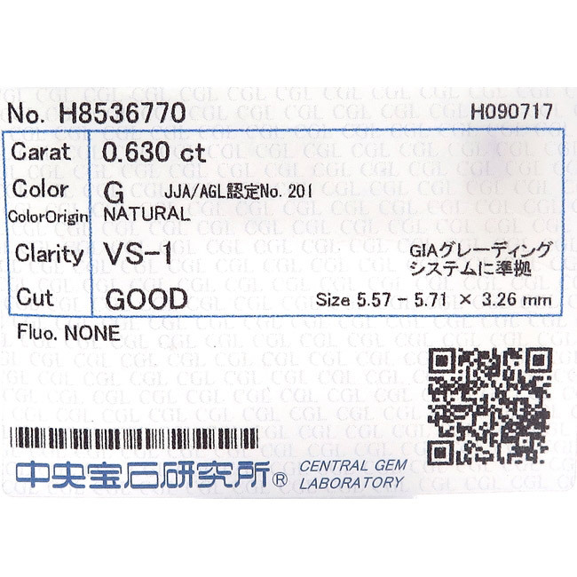 > ダイヤモンド ルース 0.630ct G VS-1 GOOD 5.57-5.71mm×3.26mm 中央宝石 ソーティング付き 裸石 宝石【中古】/29692/10013916