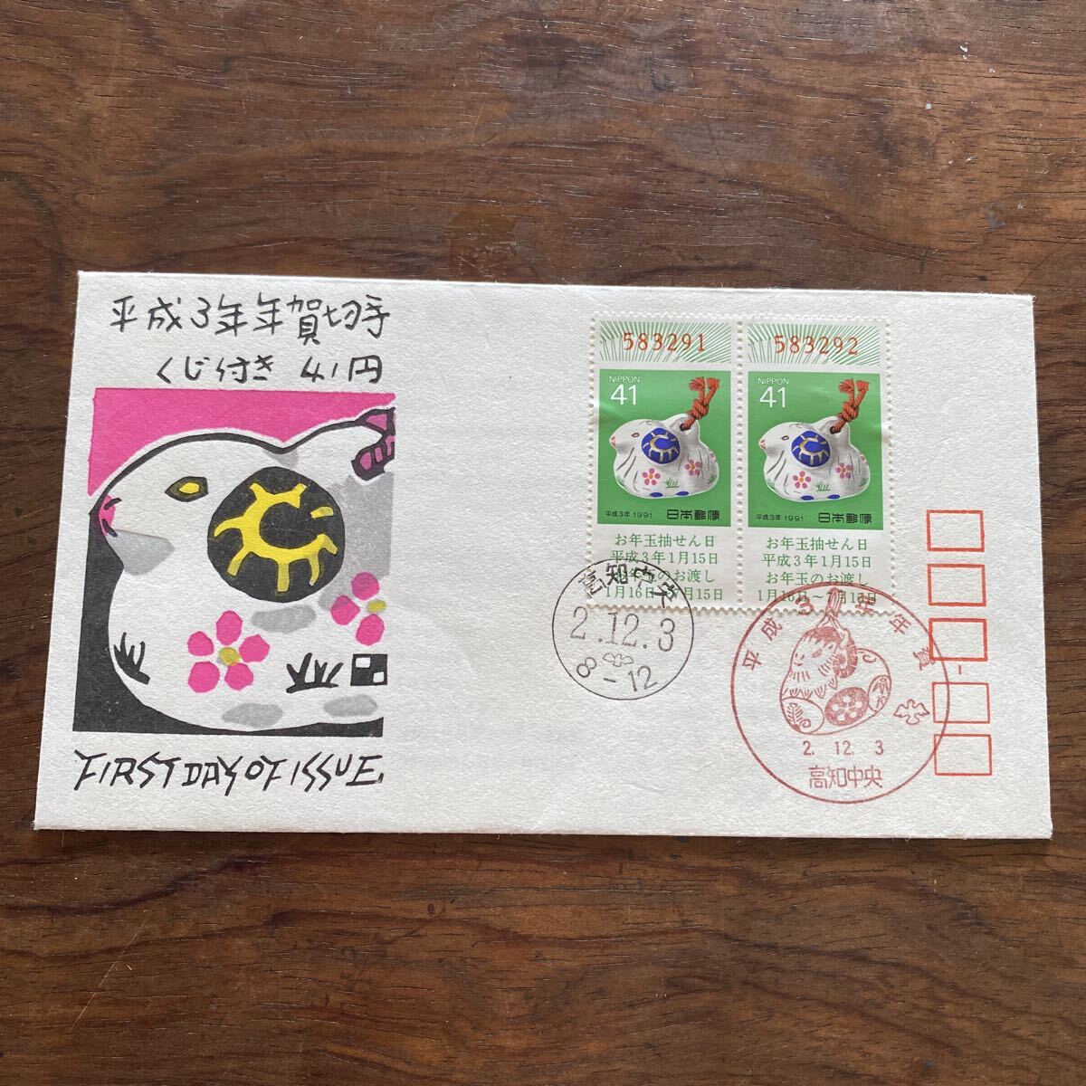 - [猫] 初日カバー 平成3年年賀切手 高知中央