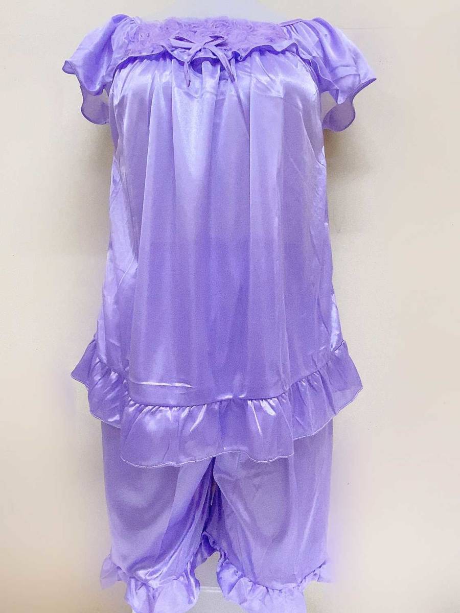 - ライトバイオレット レディース 半袖パジャマ 上下セット ポリエステル 紫 パープル フリル リボン 透け感 ルームウェア ショートパンツ