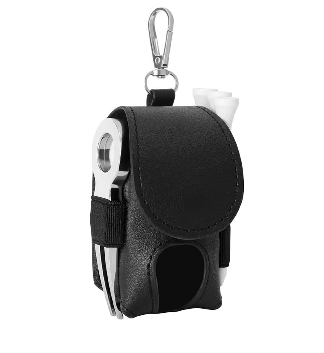 - ゴルフボールケース 2個入れ用ゴルフボールポーチ グリーンフォーク付き ボールマーカー付き ゴルフティー付き PUレザー ブラック