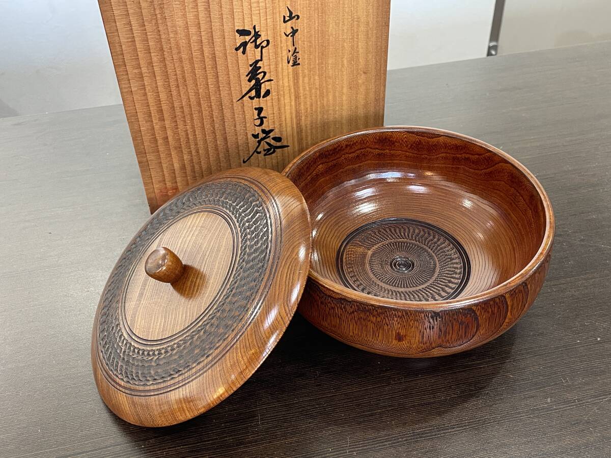 - ★【うるし塗 茶道具 漆器 天然木製】山中塗 くりぬき 木目 千筋 フタ 蓋付き 菓子器★未使用品