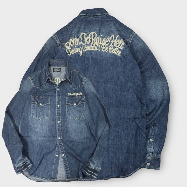 - ★Bron To Raise Hellバック刺繍★ウエスタンデニムシャツ★STOOGE&CO 長袖シャツ sizeS スナップボタン 古着 クリーニング プレス済み 79